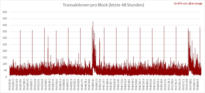 Diese Grafiken zeigen die Anzahl der Transaktionen pro Tag, die höchste Anzahl an Transaktionen pro Block, die durchschnittliche Anzahl an Transaktionen pro Block und die Anzahl der Transaktionen pro Block in den letzten 48 Stunden. Hier bekommt man eine Vorstellung von der gesamten Aktivität auf der Blockchain.