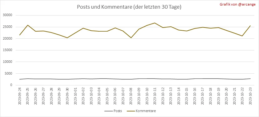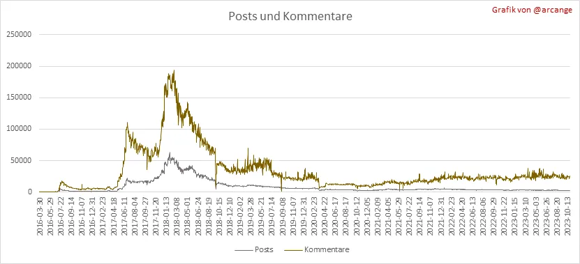 Diese Grafiken zeigen die Entwicklung von Posts und Kommentaren über die gesamte Blockchain-Lebensdauer und der letzten 30 Tage.