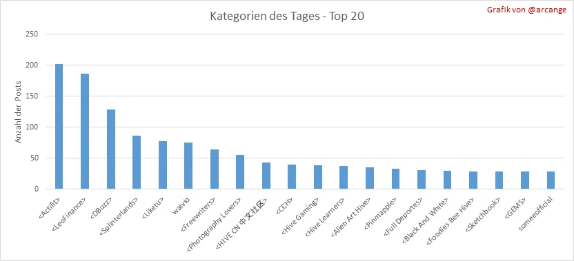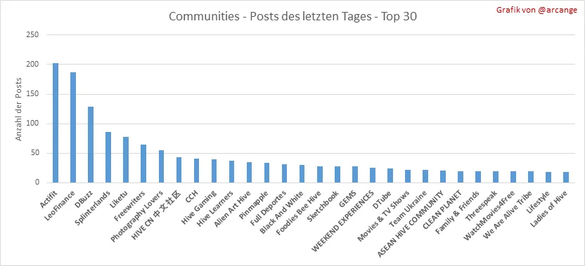 Diese Grafiken zeigen die aktivsten Communitys nach Anzahl der Beiträge (Über die gesamte Blockchain-Lebensdauer und am letzten Tag).