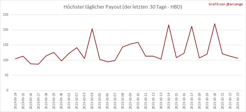 Diese Grafik zeigt den jeweils höchsten Payout, der in den letzten 30 Tagen für einen Beitrag (oder Kommentar) gezahlt wurde.