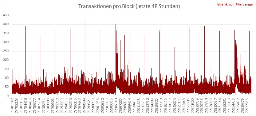 Diese Grafiken zeigen die Anzahl der Transaktionen pro Tag, die höchste Anzahl an Transaktionen pro Block, die durchschnittliche Anzahl an Transaktionen pro Block und die Anzahl der Transaktionen pro Block in den letzten 48 Stunden. Hier bekommt man eine Vorstellung von der gesamten Aktivität auf der Blockchain.