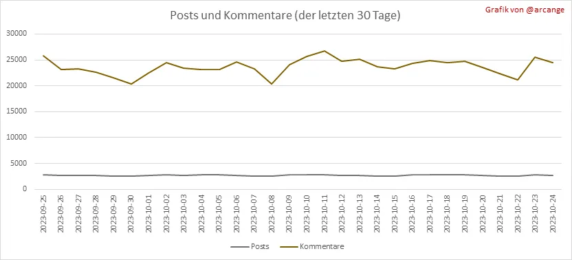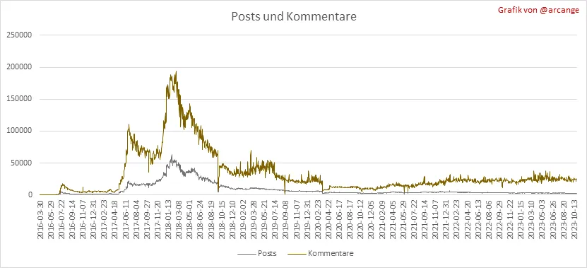 Diese Grafiken zeigen die Entwicklung von Posts und Kommentaren über die gesamte Blockchain-Lebensdauer und der letzten 30 Tage.