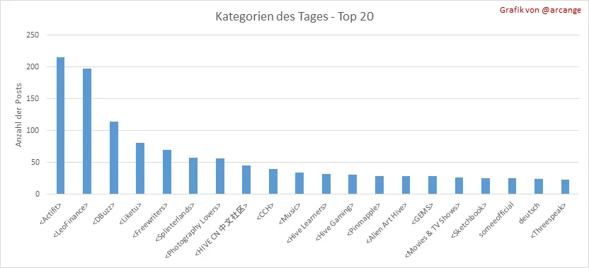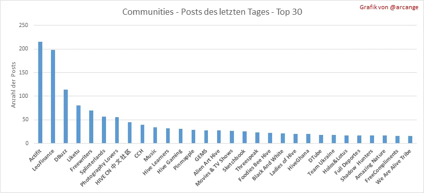 Diese Grafiken zeigen die aktivsten Communitys nach Anzahl der Beiträge (Über die gesamte Blockchain-Lebensdauer und am letzten Tag).