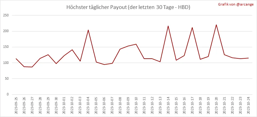 Diese Grafik zeigt den jeweils höchsten Payout, der in den letzten 30 Tagen für einen Beitrag (oder Kommentar) gezahlt wurde.