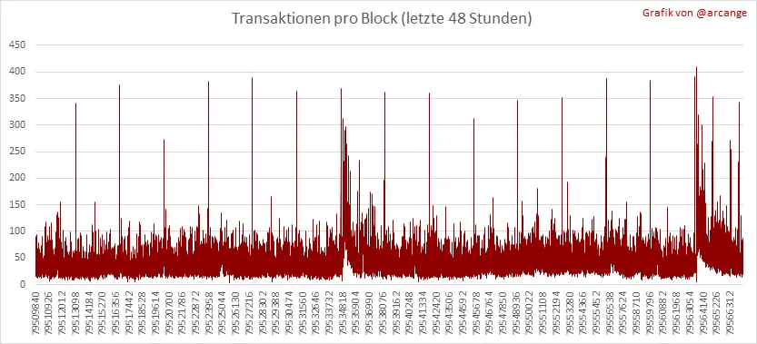 Diese Grafiken zeigen die Anzahl der Transaktionen pro Tag, die höchste Anzahl an Transaktionen pro Block, die durchschnittliche Anzahl an Transaktionen pro Block und die Anzahl der Transaktionen pro Block in den letzten 48 Stunden. Hier bekommt man eine Vorstellung von der gesamten Aktivität auf der Blockchain.
