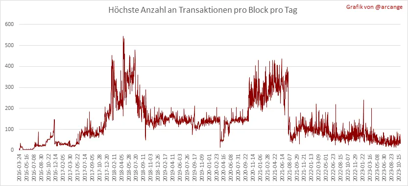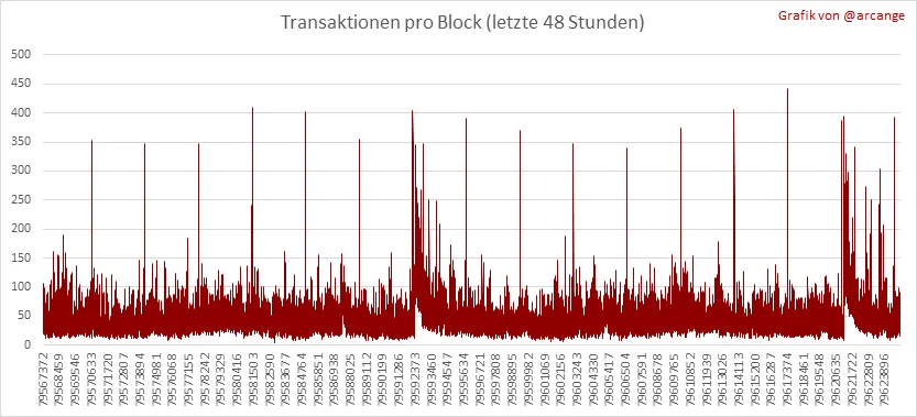 Diese Grafiken zeigen die Anzahl der Transaktionen pro Tag, die höchste Anzahl an Transaktionen pro Block, die durchschnittliche Anzahl an Transaktionen pro Block und die Anzahl der Transaktionen pro Block in den letzten 48 Stunden. Hier bekommt man eine Vorstellung von der gesamten Aktivität auf der Blockchain.