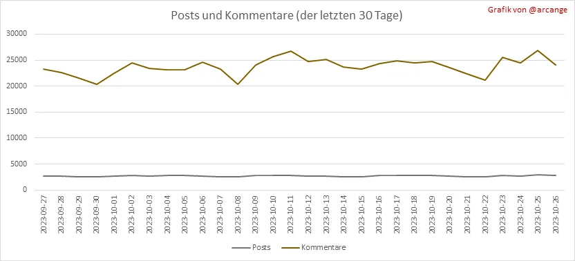 Diese Grafiken zeigen die Entwicklung von Posts und Kommentaren über die gesamte Blockchain-Lebensdauer und der letzten 30 Tage.