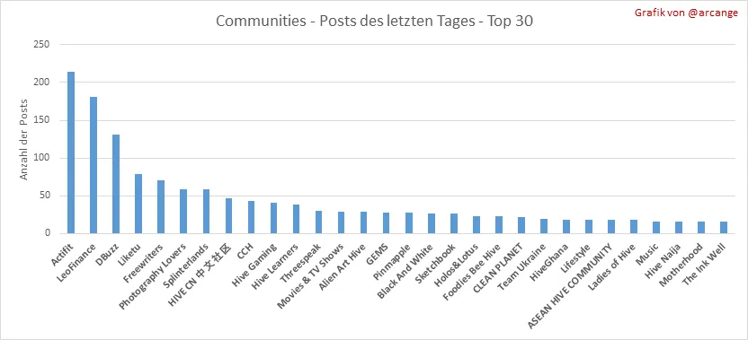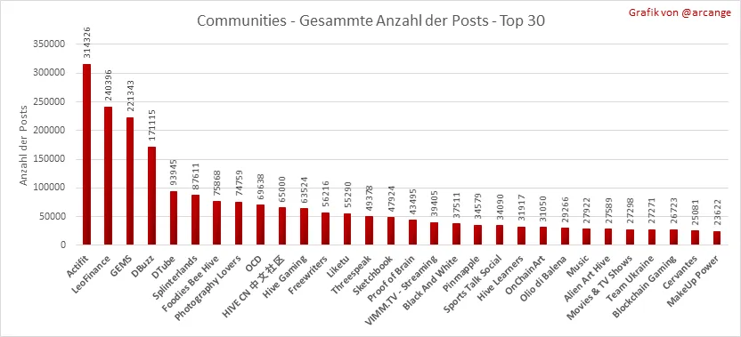 Diese Grafiken zeigen die aktivsten Communitys nach Anzahl der Beiträge (Über die gesamte Blockchain-Lebensdauer und am letzten Tag).