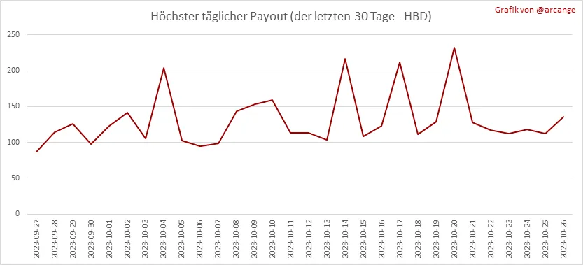 Diese Grafik zeigt den jeweils höchsten Payout, der in den letzten 30 Tagen für einen Beitrag (oder Kommentar) gezahlt wurde.