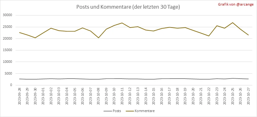 Diese Grafiken zeigen die Entwicklung von Posts und Kommentaren über die gesamte Blockchain-Lebensdauer und der letzten 30 Tage.