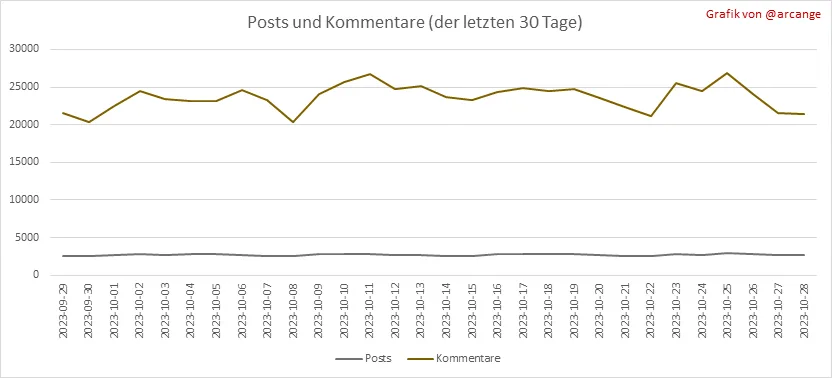 Diese Grafiken zeigen die Entwicklung von Posts und Kommentaren über die gesamte Blockchain-Lebensdauer und der letzten 30 Tage.