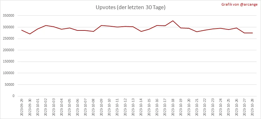 Diese Grafiken zeigen die Entwicklung der Kuration (Upvotes) über die gesamte Blockchain-Lebensdauer und der letzten 30 Tage.