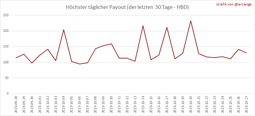Diese Grafik zeigt den jeweils höchsten Payout, der in den letzten 30 Tagen für einen Beitrag (oder Kommentar) gezahlt wurde.