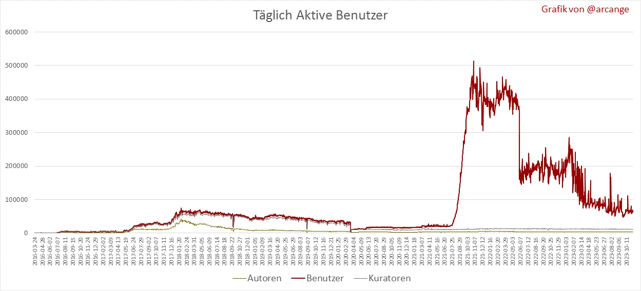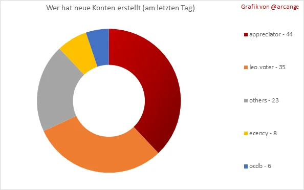 Diese beiden Grafiken zeigen, wer am letzten Tag neue Konten erstellt hat, und die Gesamtzahl der registrierten Konten. Die rote Linie zeigt an, wie viele der Konten mindestens einmal aktiv waren (aktiv bedeutet, einen Beitrag zu veröffentlichen, zu kommentieren oder zu voten). Sie zählen dazu, auch wenn sie später inaktiv werden.
