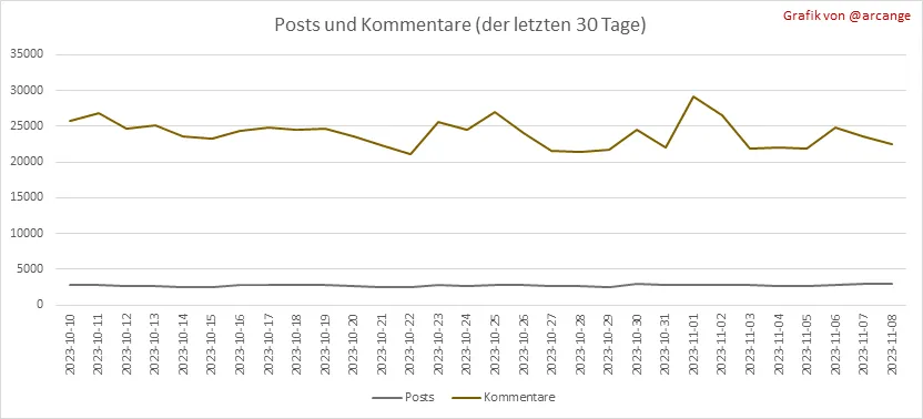 Diese Grafiken zeigen die Entwicklung von Posts und Kommentaren über die gesamte Blockchain-Lebensdauer und der letzten 30 Tage.