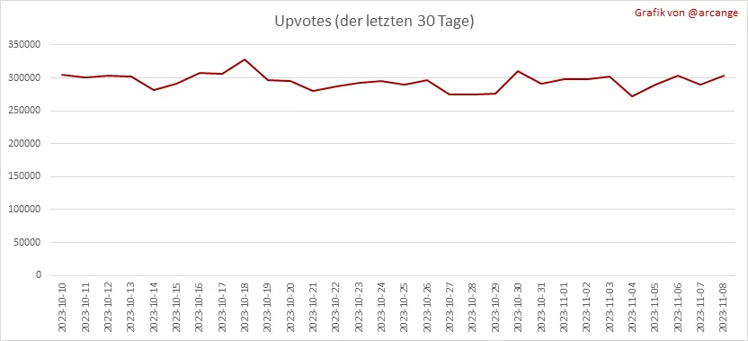 Diese Grafiken zeigen die Entwicklung der Kuration (Upvotes) über die gesamte Blockchain-Lebensdauer und der letzten 30 Tage.