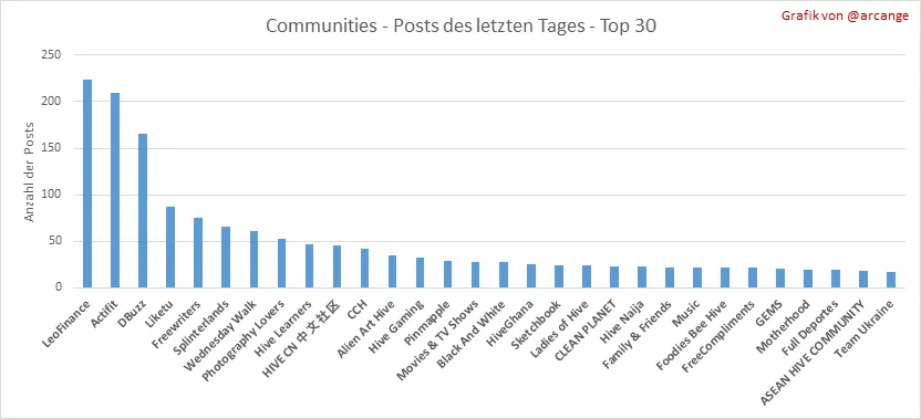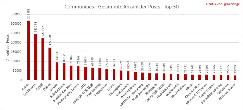 Diese Grafiken zeigen die aktivsten Communitys nach Anzahl der Beiträge (Über die gesamte Blockchain-Lebensdauer und am letzten Tag).