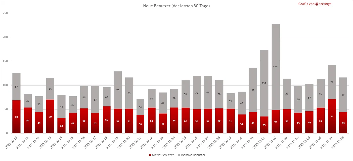 Der graue Teil jeder Spalte gibt an, wie viele Konten inaktiv sind (all Diejenigen, die in den letzten 30 Tagen nicht gepostet, kommentiert oder gevotet haben).
