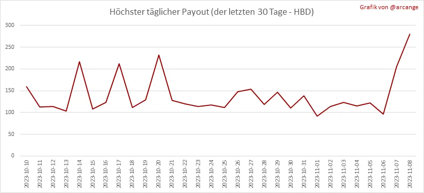 Diese Grafik zeigt den jeweils höchsten Payout, der in den letzten 30 Tagen für einen Beitrag (oder Kommentar) gezahlt wurde.