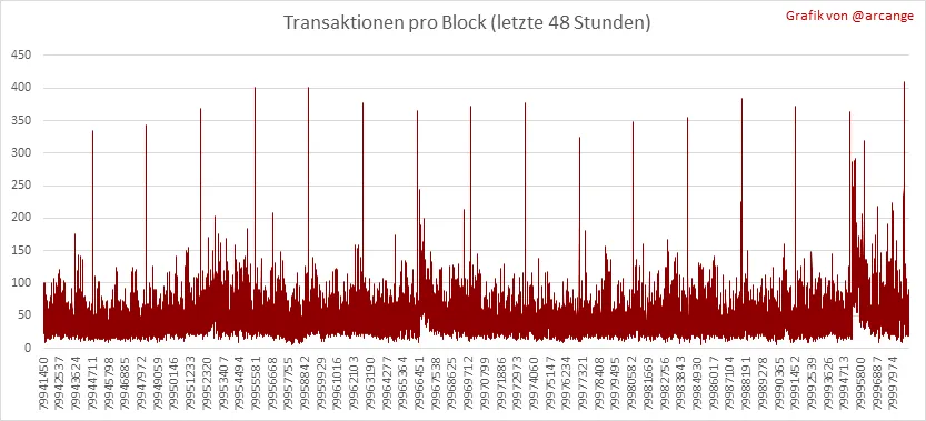Diese Grafiken zeigen die Anzahl der Transaktionen pro Tag, die höchste Anzahl an Transaktionen pro Block, die durchschnittliche Anzahl an Transaktionen pro Block und die Anzahl der Transaktionen pro Block in den letzten 48 Stunden. Hier bekommt man eine Vorstellung von der gesamten Aktivität auf der Blockchain.