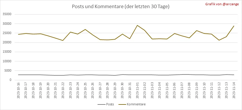Diese Grafiken zeigen die Entwicklung von Posts und Kommentaren über die gesamte Blockchain-Lebensdauer und der letzten 30 Tage.