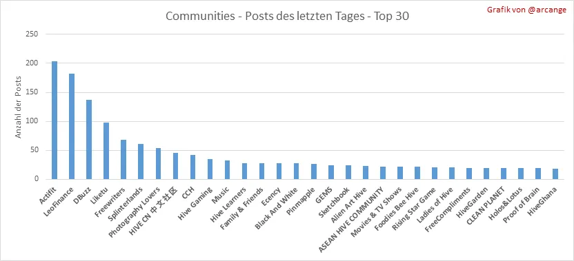 Diese Grafiken zeigen die aktivsten Communitys nach Anzahl der Beiträge (Über die gesamte Blockchain-Lebensdauer und am letzten Tag).