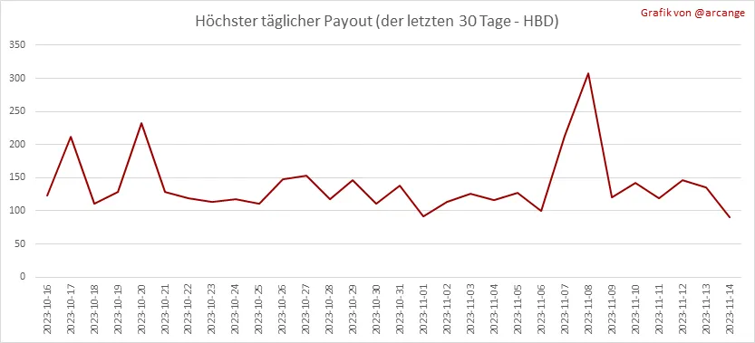 Diese Grafik zeigt den jeweils höchsten Payout, der in den letzten 30 Tagen für einen Beitrag (oder Kommentar) gezahlt wurde.