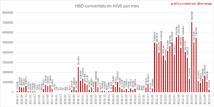 Estos gráficos muestran el número de HIVE realmente utilizado por el proceso de conversión (HIVE convertido + 5% HIVE fresco que se destruye) cada día y cada mes después de que se hayan finalizado las solicitudes de conversión de HIVE a HBD.