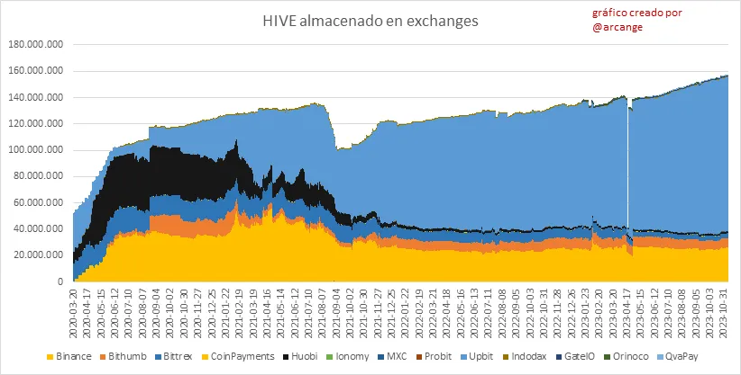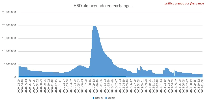 Estos gráficos muestran la evolución diaria de HIVE y HBD almacenados en los exchanges donde se enumeran.