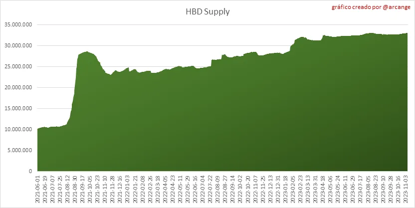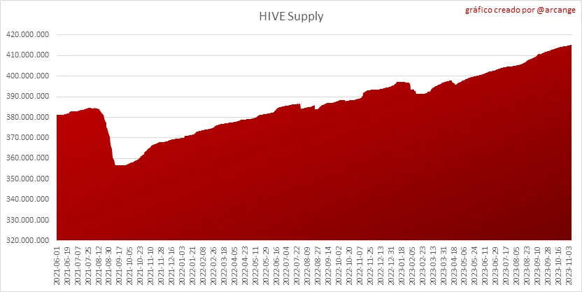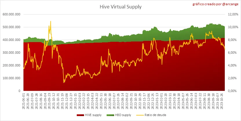 Este gráfico muestra la evolución de la oferta virtual de HIVE. La oferta virtual (Virtual Supply) es la suma de la oferta en HIVE (líquida o bloqueada en Hive Power) y la oferta en HBD (convertida en HIVE).