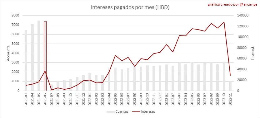Este gráfico muestra el interés pagado mensualmente por mantener HBD y cuántas cuentas recibieron ese interés.