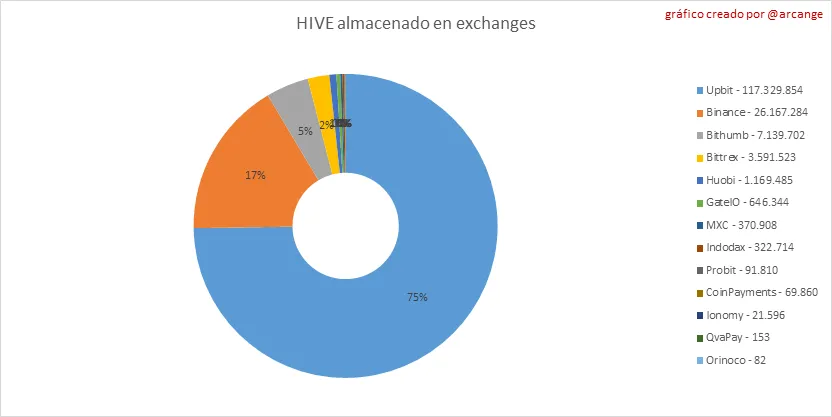 Estos gráficos muestran la cantidad y distribución de HIVE y HBD almacenados en los exchanges donde se enumeran.