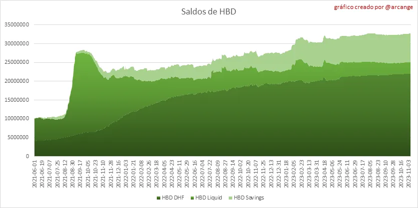 Este gráfico muestra el número de HBD, liquido y en ahorros, en todas las cuentas. Este también muestra cuánto HBD hay en el Decentralized Hive Fund (DHF).