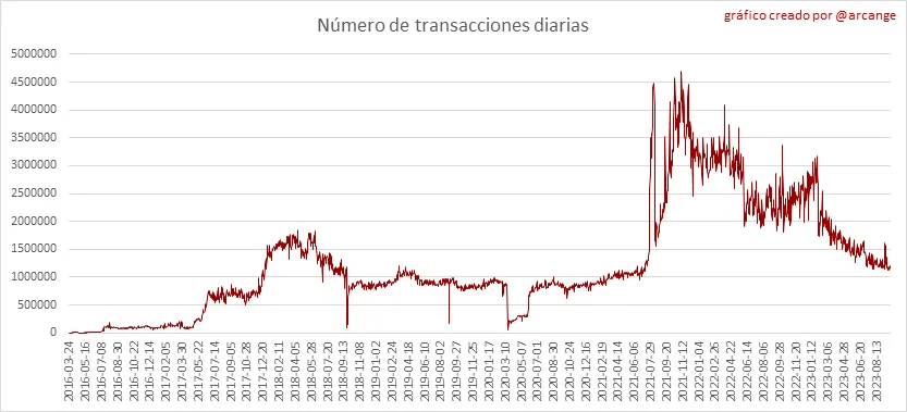 Este gráfico muestra la cantidad de usuarios recién registrados en la blockchain y cuántos de ellos son activos. ¡El gráfico es algo dinámico! Un usuario puede registrarse un día y volverse activo unos días después. por lo que los datos pueden cambiar de un día a otro.