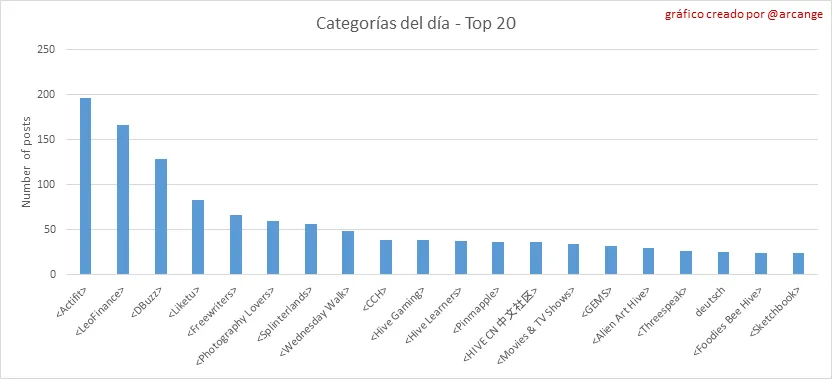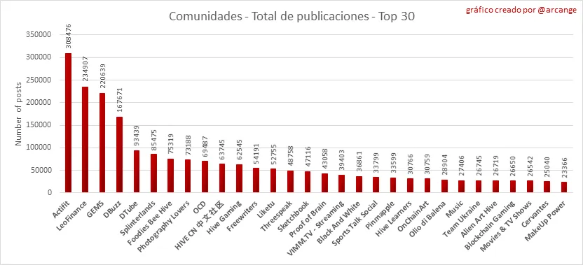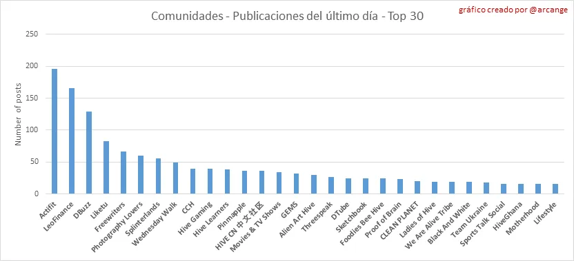 Estos gráficos muestran las comunidades más activas por número de publicaciones (vida útil de blockchain y último día).