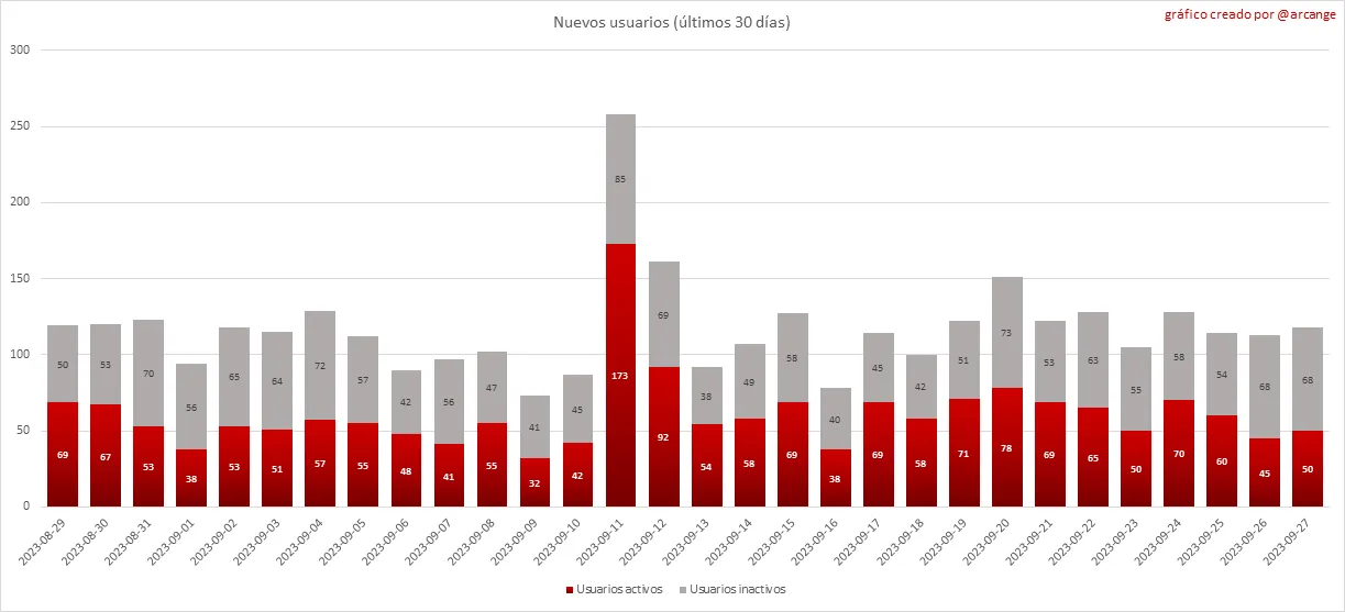 Estos dos gráficos muestran quién creó nuevas cuentas durante el último día y el número total de cuentas registradas. La línea roja muestra cuántas de ellas han estado activas al menos una vez (activa significa publicar un post, comentar o votar). Están incluidas incluso si se vuelven inactivos más tarde.