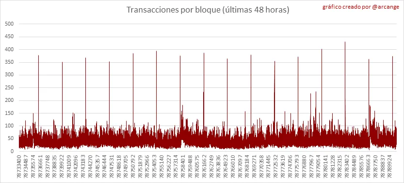 Estos gráficos muestran la cantidad de transacciones por día, la cantidad más alta de transacciones por bloque, la cantidad promedia de transacciones por bloque y la cantidad de transacciones por bloque durante las últimas 48 horas. Esto le da una idea de toda la actividad en la blockchain.