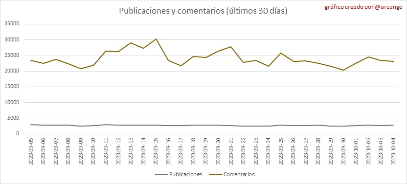 Estos gráficos muestran la evolución de publicaciones y comentarios durante toda la vida útil de la blockchain y durante los últimos 30 días.