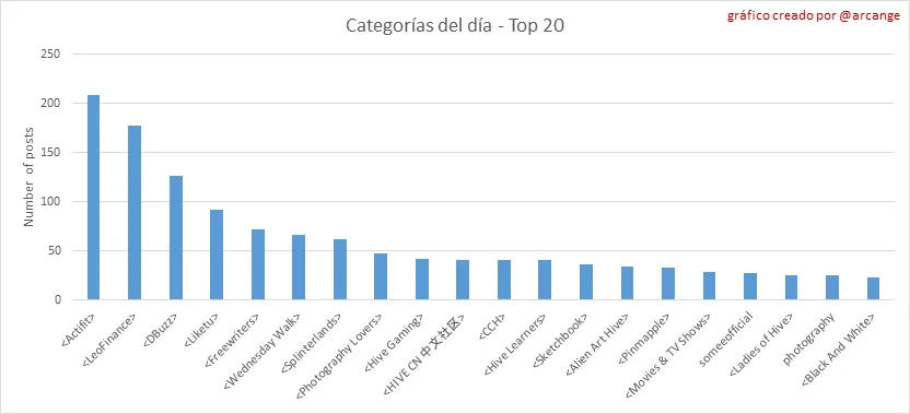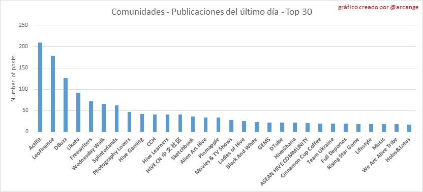 Estos gráficos muestran las comunidades más activas por número de publicaciones (vida útil de blockchain y último día).