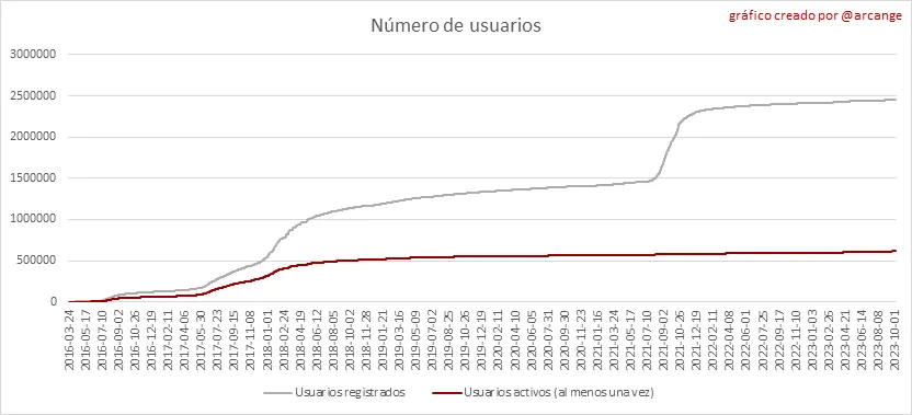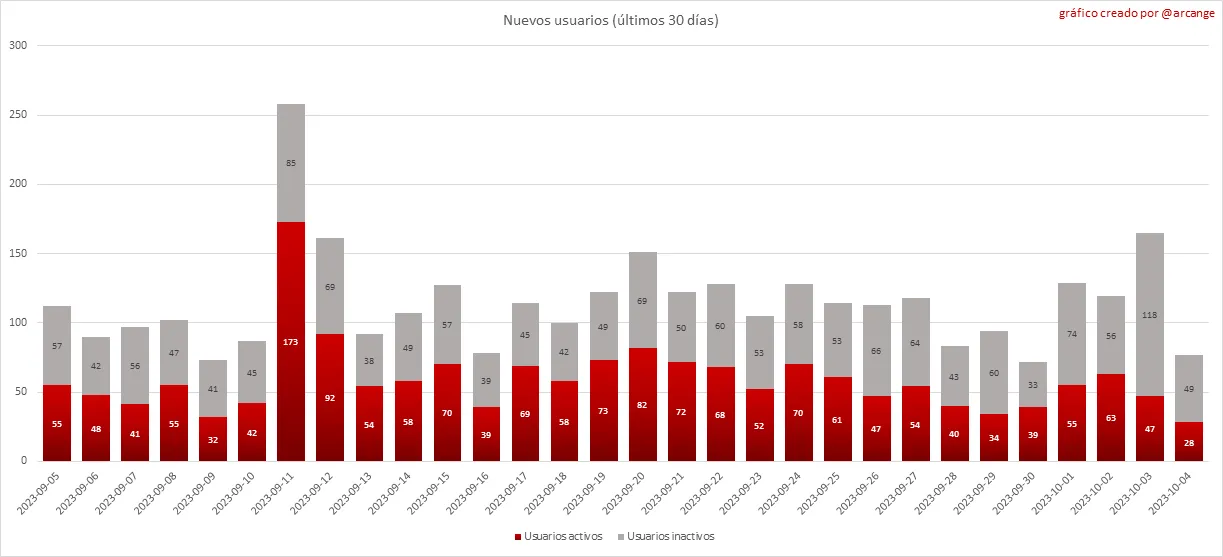 Estos dos gráficos muestran quién creó nuevas cuentas durante el último día y el número total de cuentas registradas. La línea roja muestra cuántas de ellas han estado activas al menos una vez (activa significa publicar un post, comentar o votar). Están incluidas incluso si se vuelven inactivos más tarde.