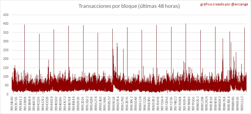 Estos gráficos muestran la cantidad de transacciones por día, la cantidad más alta de transacciones por bloque, la cantidad promedia de transacciones por bloque y la cantidad de transacciones por bloque durante las últimas 48 horas. Esto le da una idea de toda la actividad en la blockchain.