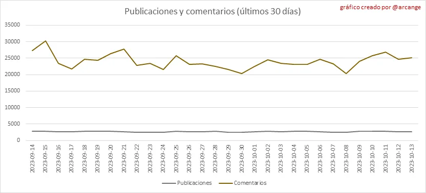 Estos gráficos muestran la evolución de publicaciones y comentarios durante toda la vida útil de la blockchain y durante los últimos 30 días.