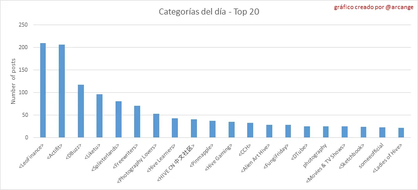 Estos gráficos muestran las comunidades más activas por número de publicaciones (vida útil de blockchain y último día).