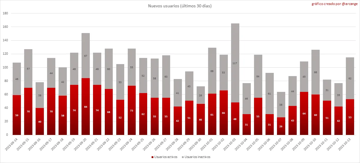 Estos dos gráficos muestran quién creó nuevas cuentas durante el último día y el número total de cuentas registradas. La línea roja muestra cuántas de ellas han estado activas al menos una vez (activa significa publicar un post, comentar o votar). Están incluidas incluso si se vuelven inactivos más tarde.
