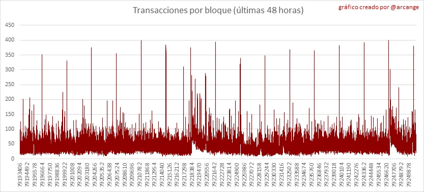 Estos gráficos muestran la cantidad de transacciones por día, la cantidad más alta de transacciones por bloque, la cantidad promedia de transacciones por bloque y la cantidad de transacciones por bloque durante las últimas 48 horas. Esto le da una idea de toda la actividad en la blockchain.