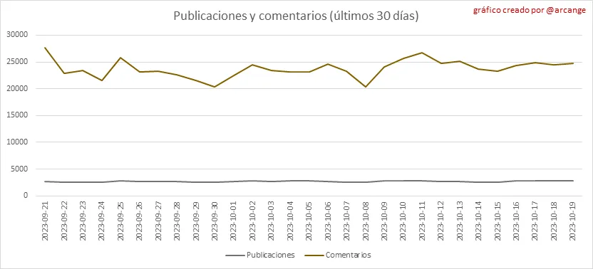 Estos gráficos muestran la evolución de publicaciones y comentarios durante toda la vida útil de la blockchain y durante los últimos 30 días.
