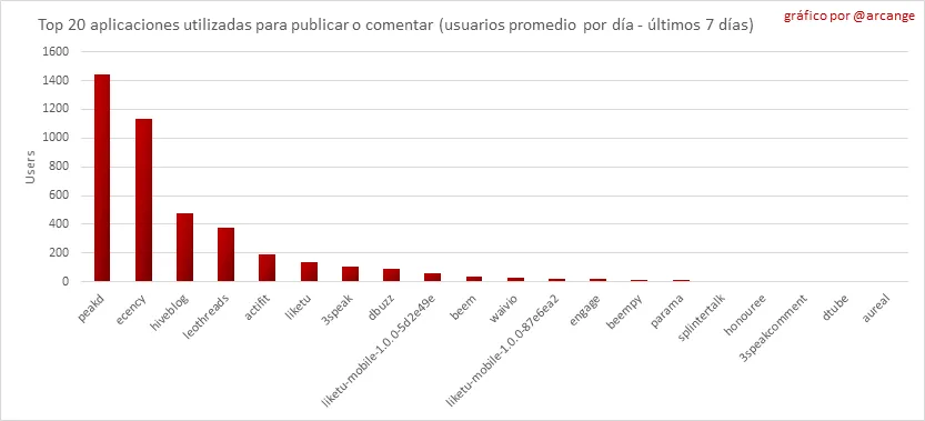 Este gráfico muestra qué aplicaciones se utilizan más para publicar posts y comentarios. Tenga en cuenta que el mismo usuario puede utilizar varias aplicaciones diferentes.