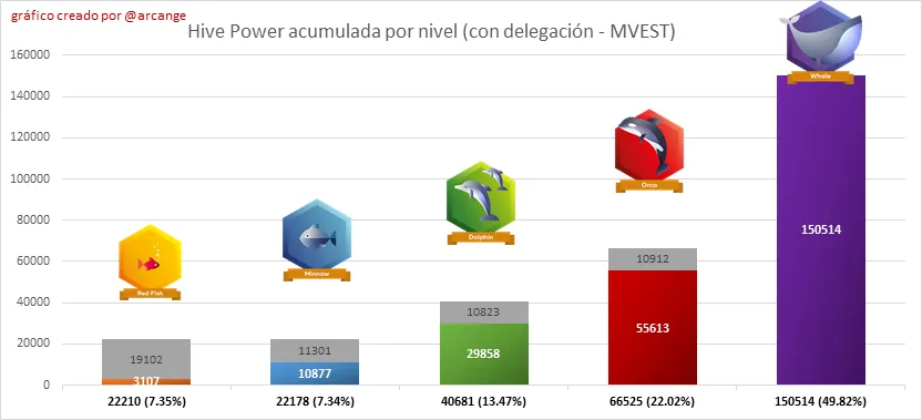 Este gráfico muestra la distribución de Hive Power acumulada por nivel de cuenta. El gráfico de la izquierda muestra la distribución sin tener en cuenta ninguna delegación realizada o recibida por las cuentas. Los gráficos de la derecha tienen en cuenta la delegación, agrega la delegación de HP recibida y resta la delegación de HP dada.