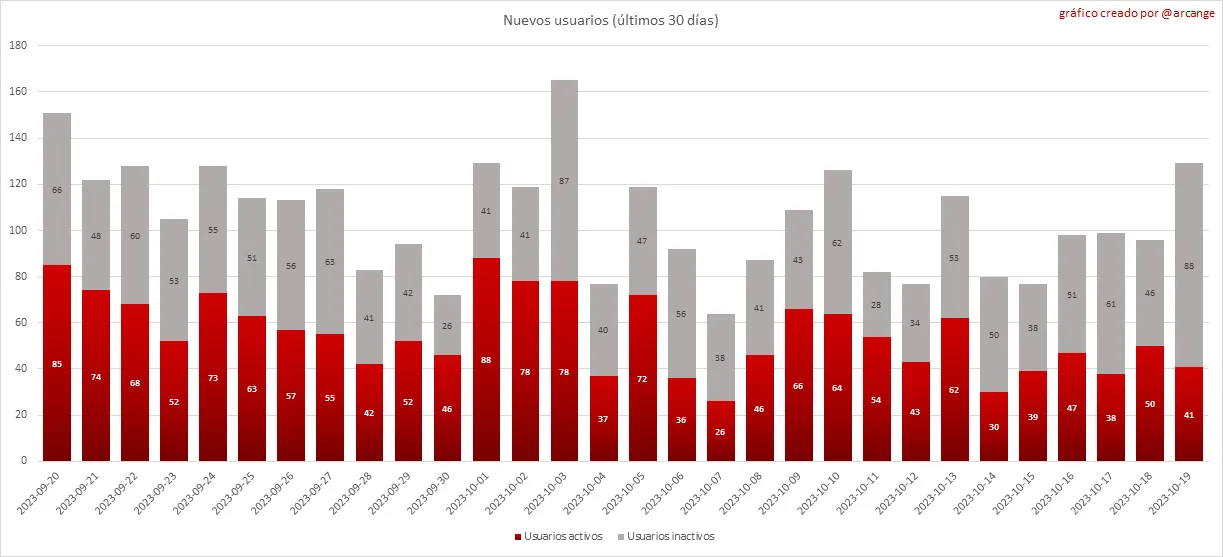 Estos dos gráficos muestran quién creó nuevas cuentas durante el último día y el número total de cuentas registradas. La línea roja muestra cuántas de ellas han estado activas al menos una vez (activa significa publicar un post, comentar o votar). Están incluidas incluso si se vuelven inactivos más tarde.