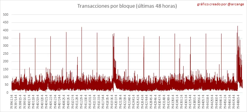 Estos gráficos muestran la cantidad de transacciones por día, la cantidad más alta de transacciones por bloque, la cantidad promedia de transacciones por bloque y la cantidad de transacciones por bloque durante las últimas 48 horas. Esto le da una idea de toda la actividad en la blockchain.